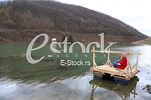 Woman looking the flooding Monastery Valjevska Gracanica in lake