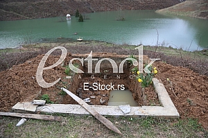 Unearthed grave near flooding Monastery Valjevska Gracanica in lake