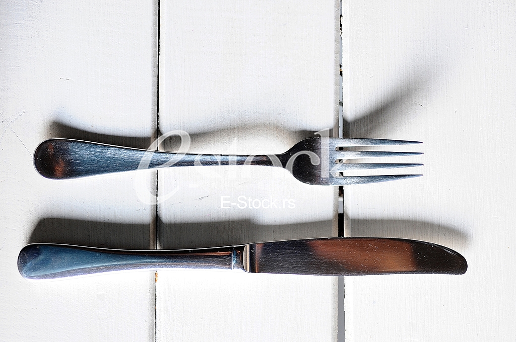 - Description: Knife and fork on a wooden background