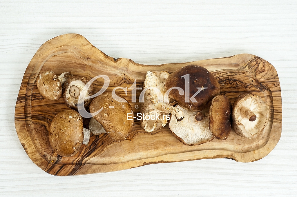 - Description: A pile of raw exotic mushrooms on a wooden plate