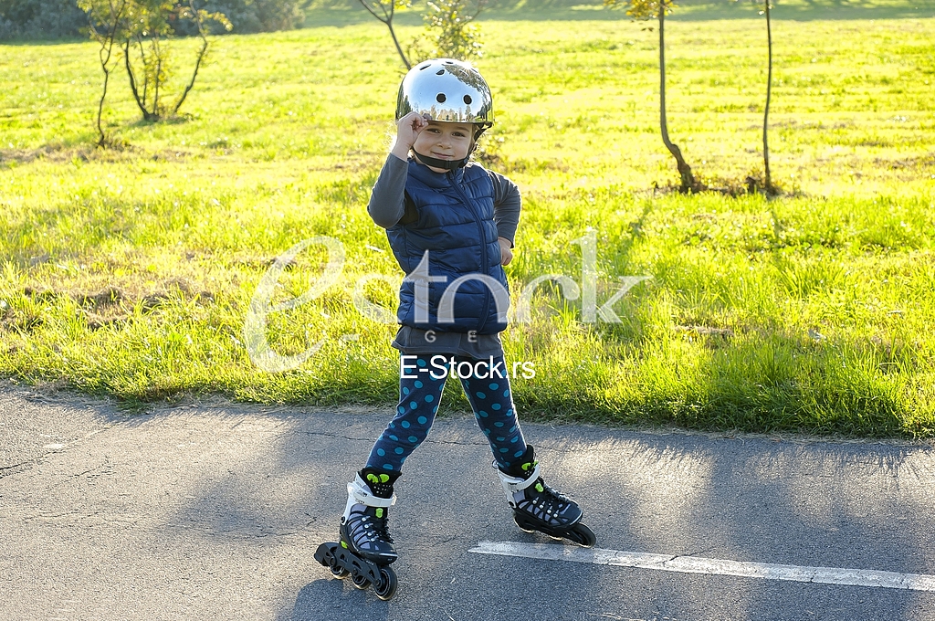 - Description: Cute girl in roller skates at a summer park.