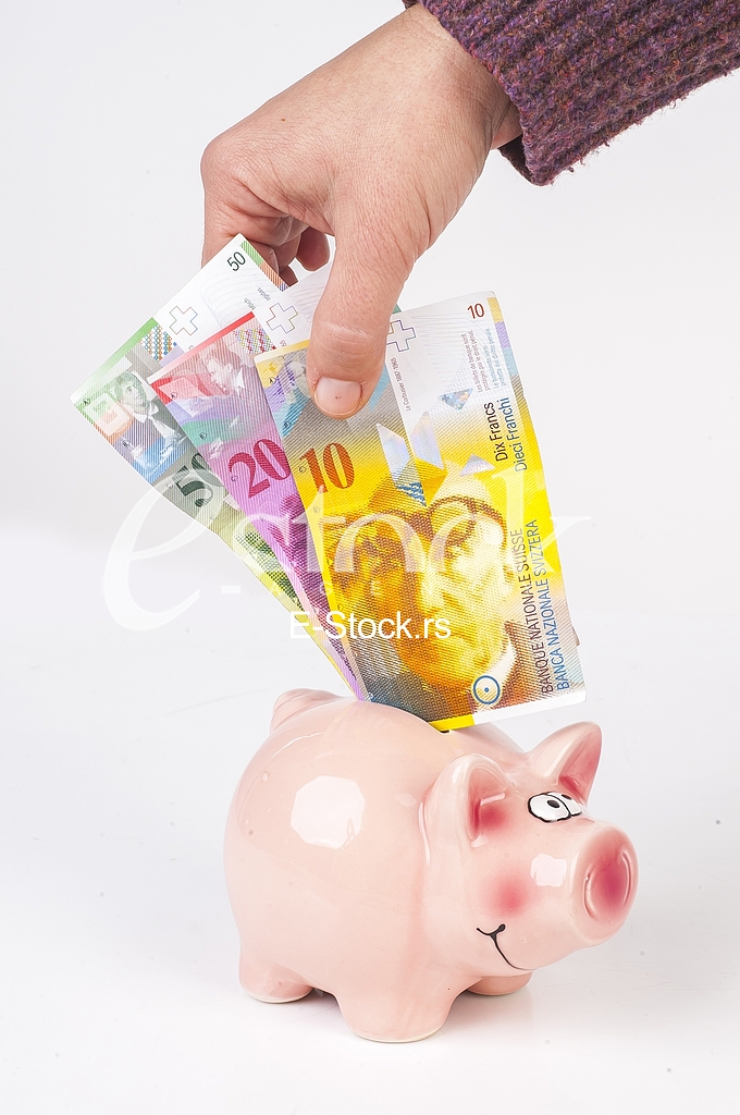 - Description: Swiss franc put in a piggy bank