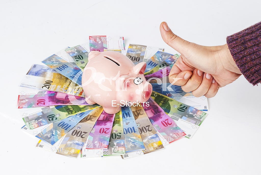 - Description: Swiss franc piggy bank and female hand showing thumbs up sign against