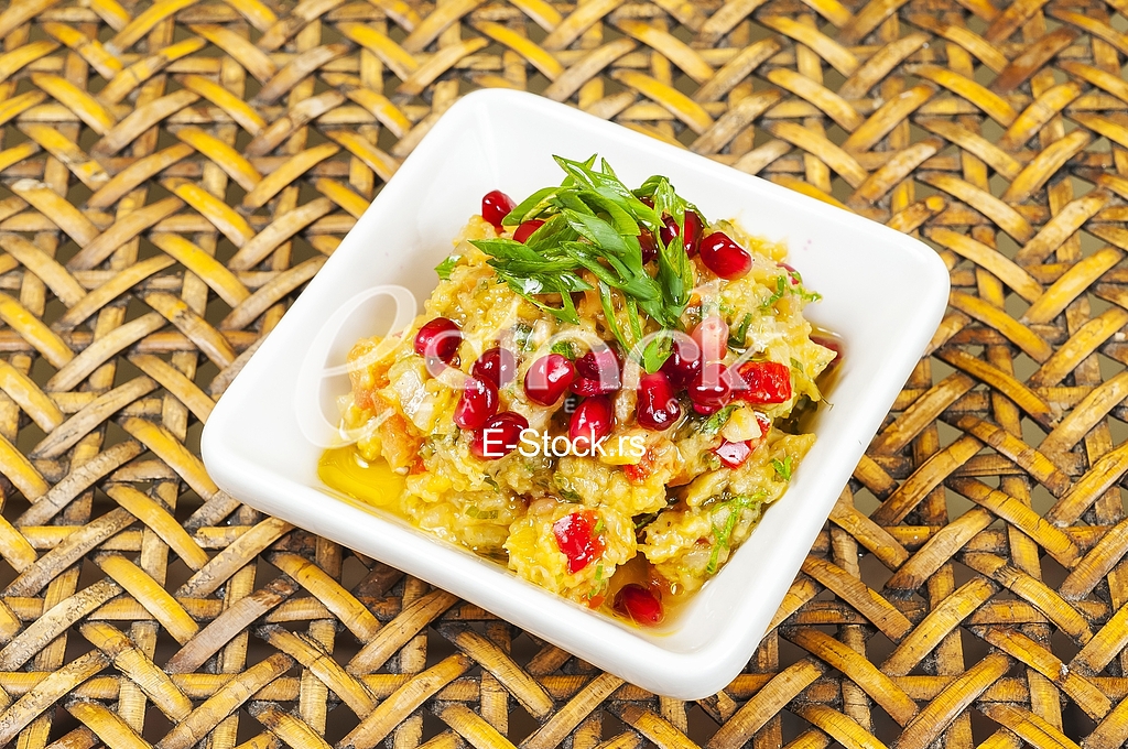 - Description: Oriental Arabic food hummus with pomegranate seeds.