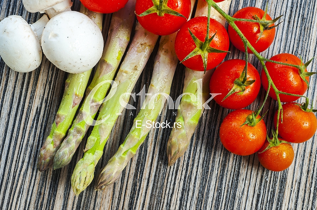 - Description: cherry tomatoes, asparagus and mushrooms on a wooden background