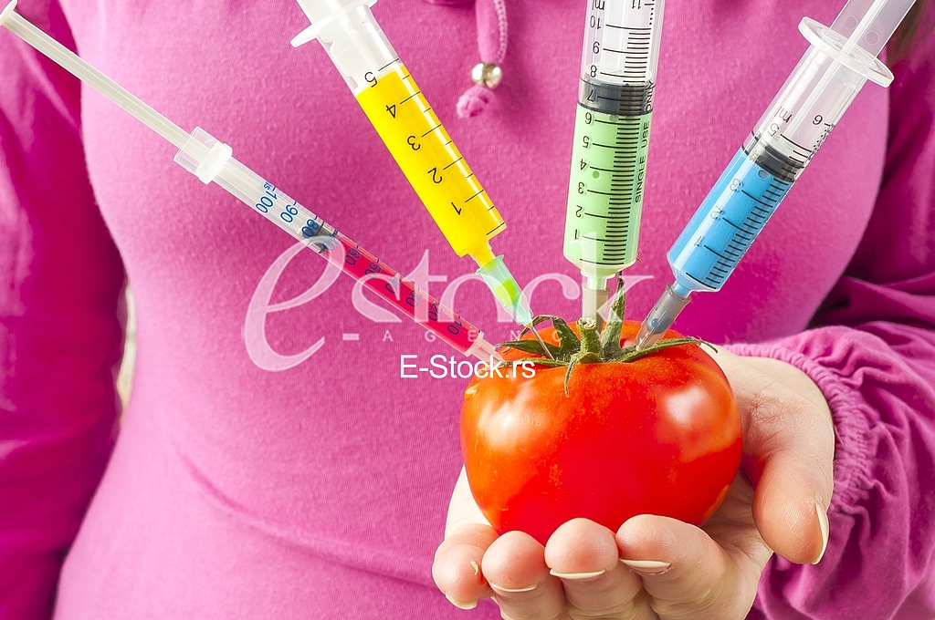 - Description: Genetically modified organism - ripe tomato with syringes in the hands of women