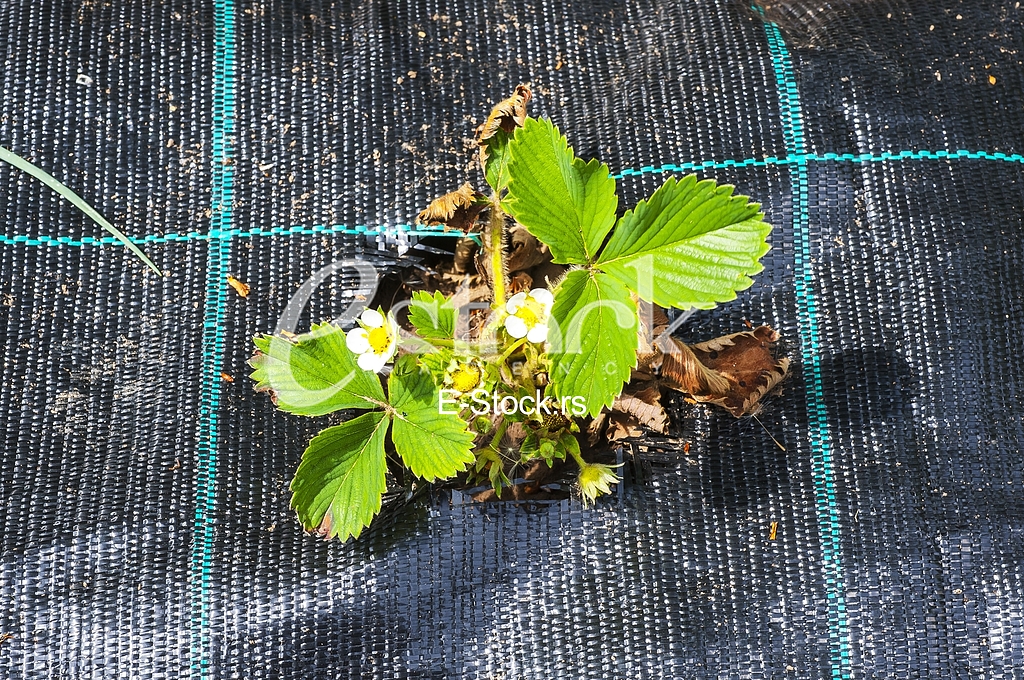 - Description: Bed under black film with flowering and fruit-bearing bushes of strawberries
