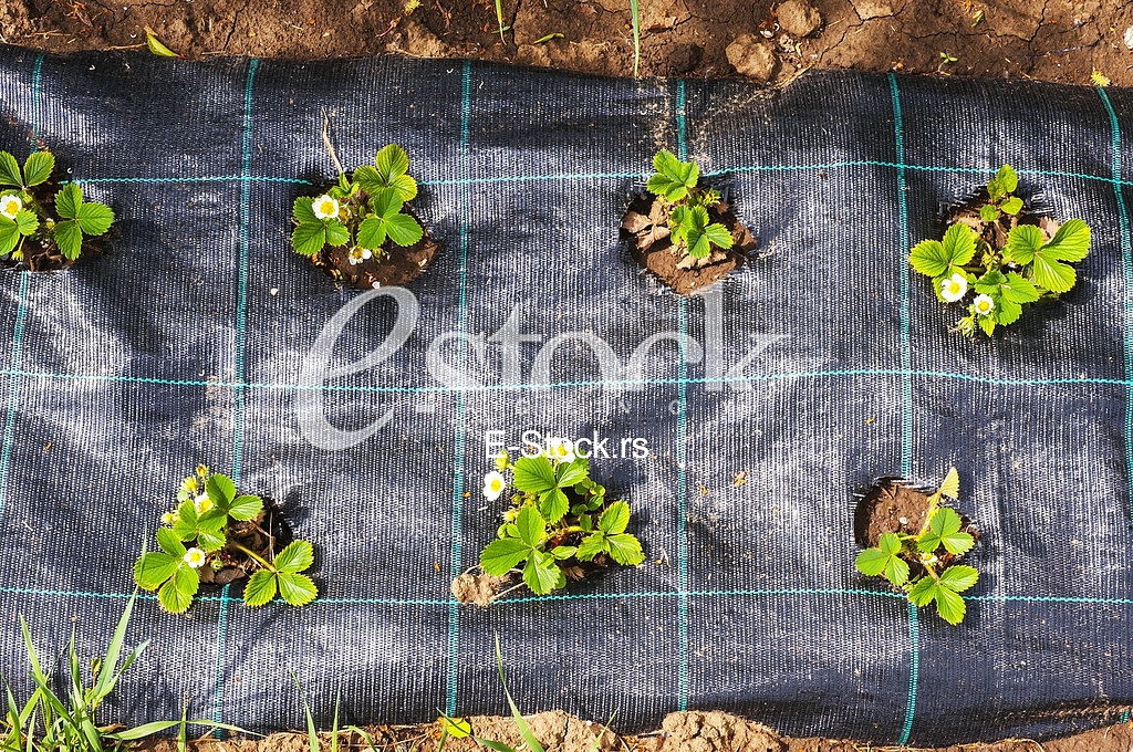 - Description: Bed under black film with flowering and fruit-bearing bushes of strawberries
