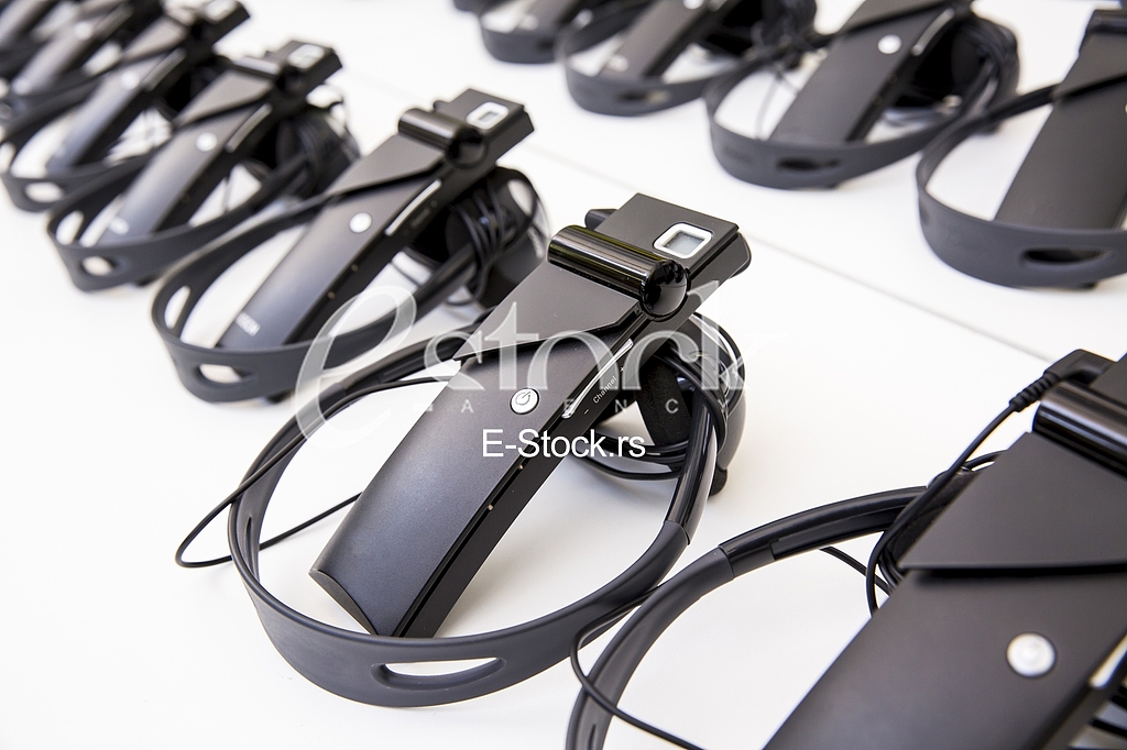 - Description: wireless multy language headphones set on the chairs in conference room
