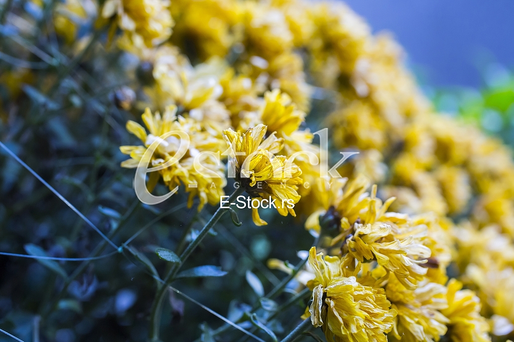 - Description: Blooming yellow Mums or Chrysanthemums with rain drops, autumn flower background