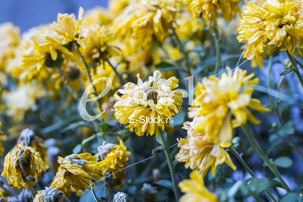 - Description: Blooming yellow Mums or Chrysanthemums with rain drops, autumn flower background