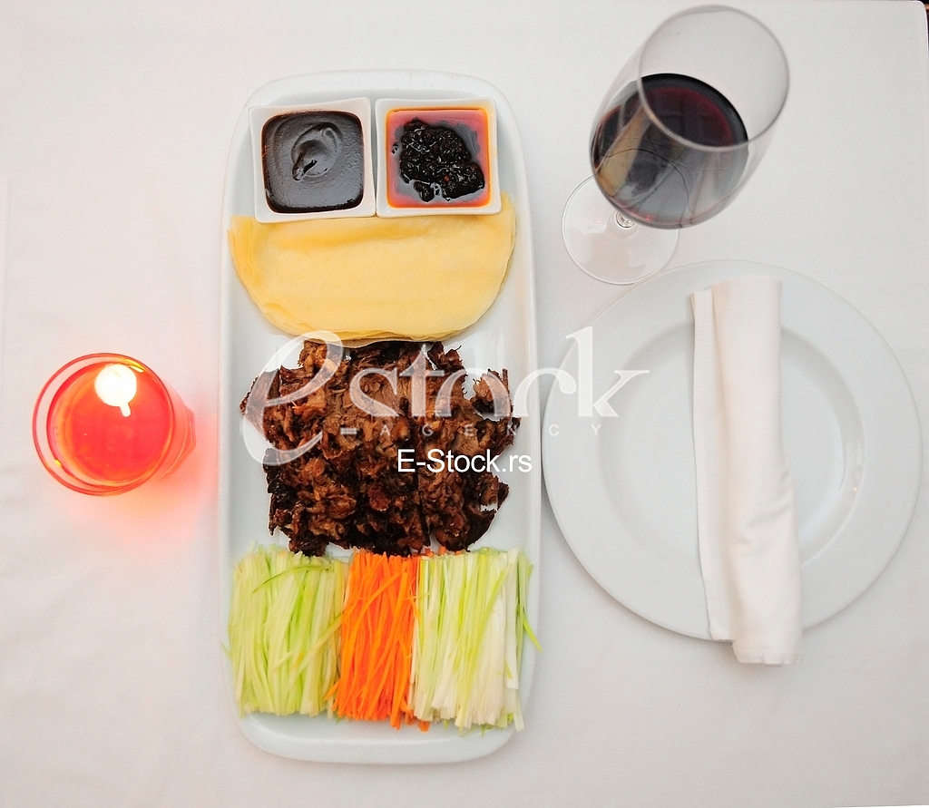 - Description: Chinese roast crispy Peking duck served with hoisin sauce, pancakes, cucumber, carrot, spring onions and a glass of red wine