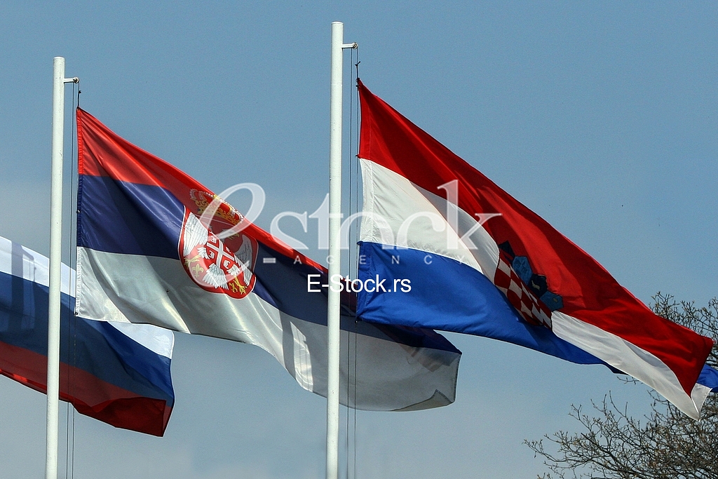 - Description: Flags of the Republic of Serbia and Republik of Croatia, flapping on a blue sky