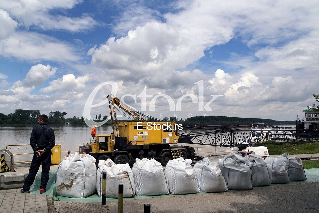 - Description: Smederevo, Serbia, May 18, 2014. Employees of public greenery, work on setting up a defensive wall of the big bags of sand on the Danube Promenade