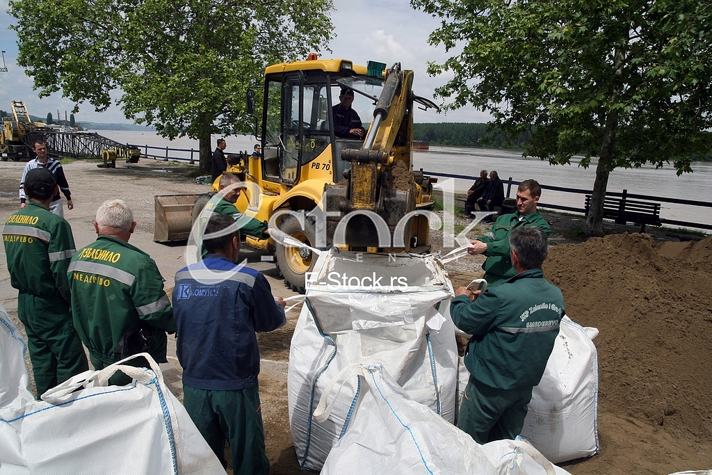 - Description: Smederevo, Serbia, May 18, 2014. Employees of public greenery, work on setting up a defensive wall of the big bags of sand on the Danube Promenade