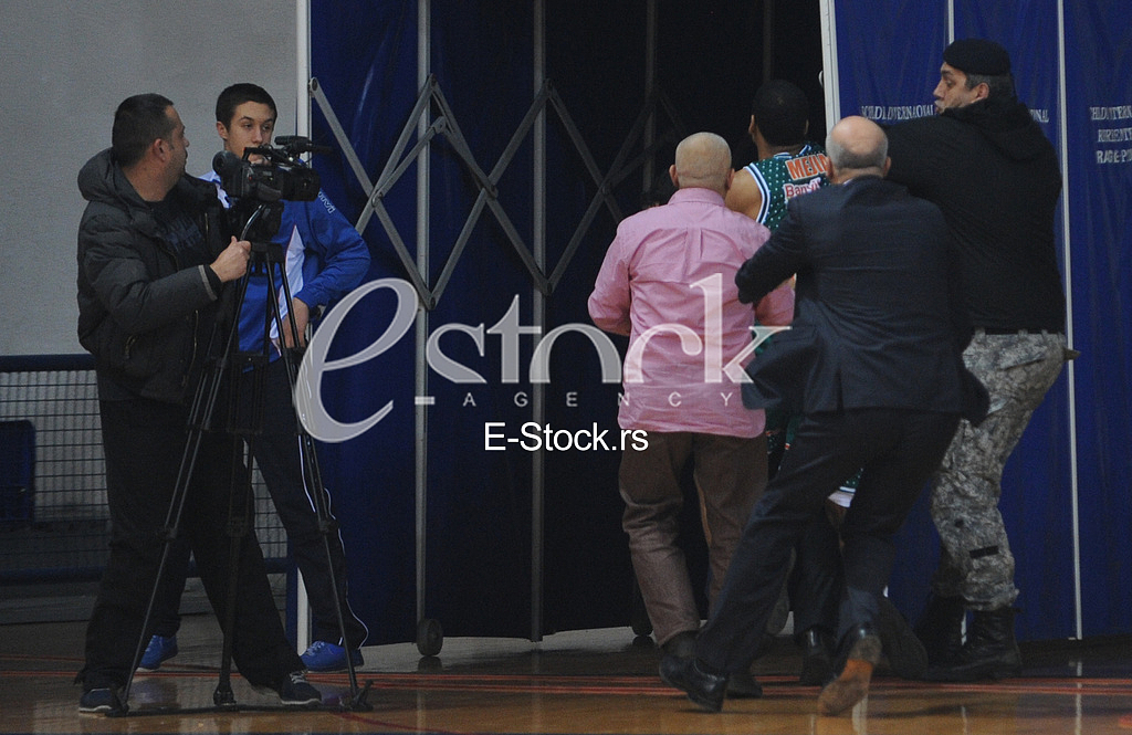 - Description: Montenegro, Podgorica 07.01.2015. Unprecedented scandal took place in the Eurocup game between Buducnost and Banvit. A little more than two minutes before the end of the game, which is usually in your favor solve the Turkish team (74:68), Buducnost fan ran on the parquet Moraca and pushed Sammy Mejia, shin Banvit. Photo E-Stock Petar Jovanovic