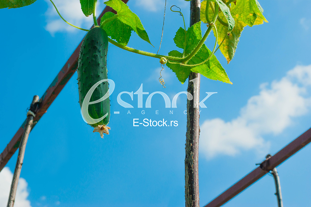 - Description: cucumber hang on branch in garden / background blue sky