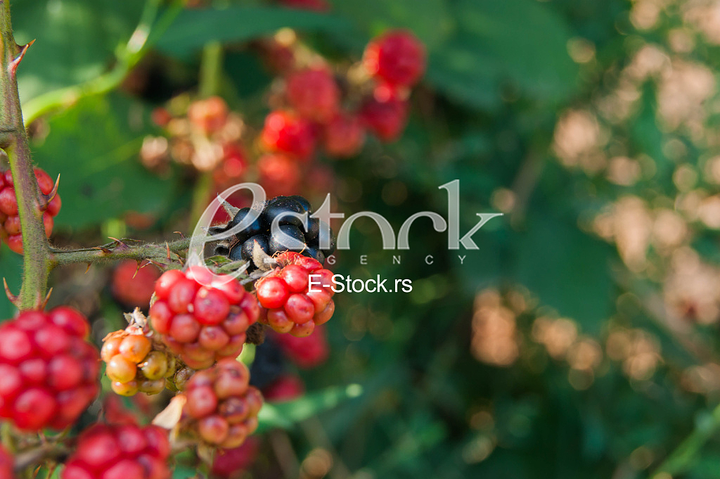- Description: A bush of delicious wild blackberries in their black and red stage on sunny day