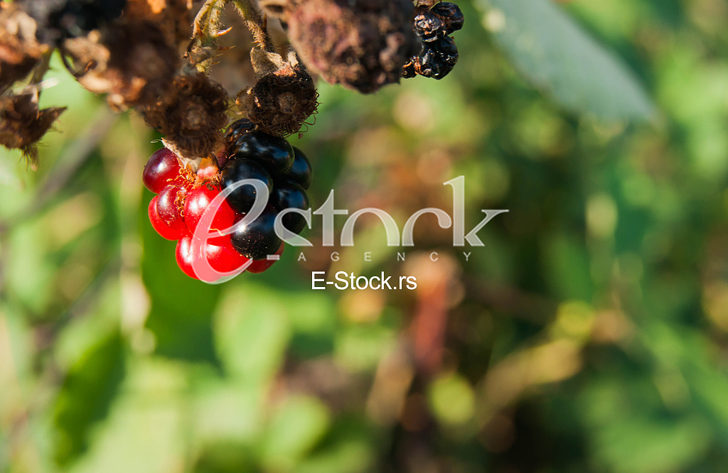 - Description: A bush of delicious wild blackberries in their black and red stage on sunny day