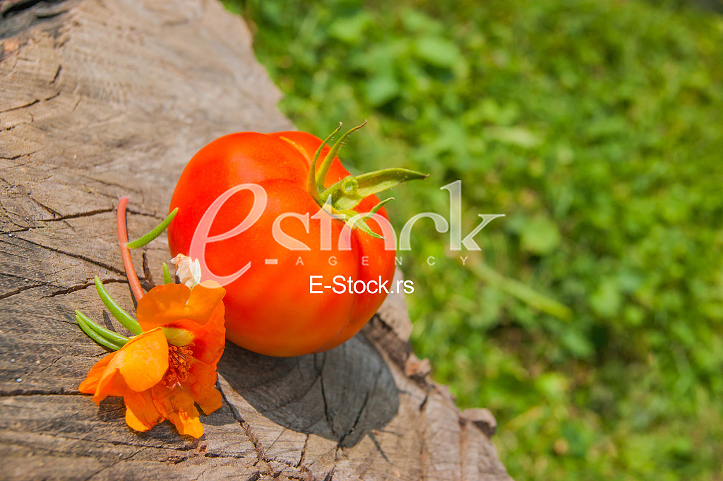 - Description: Fresh organic Tomato with flower on the stump in the sunny day
