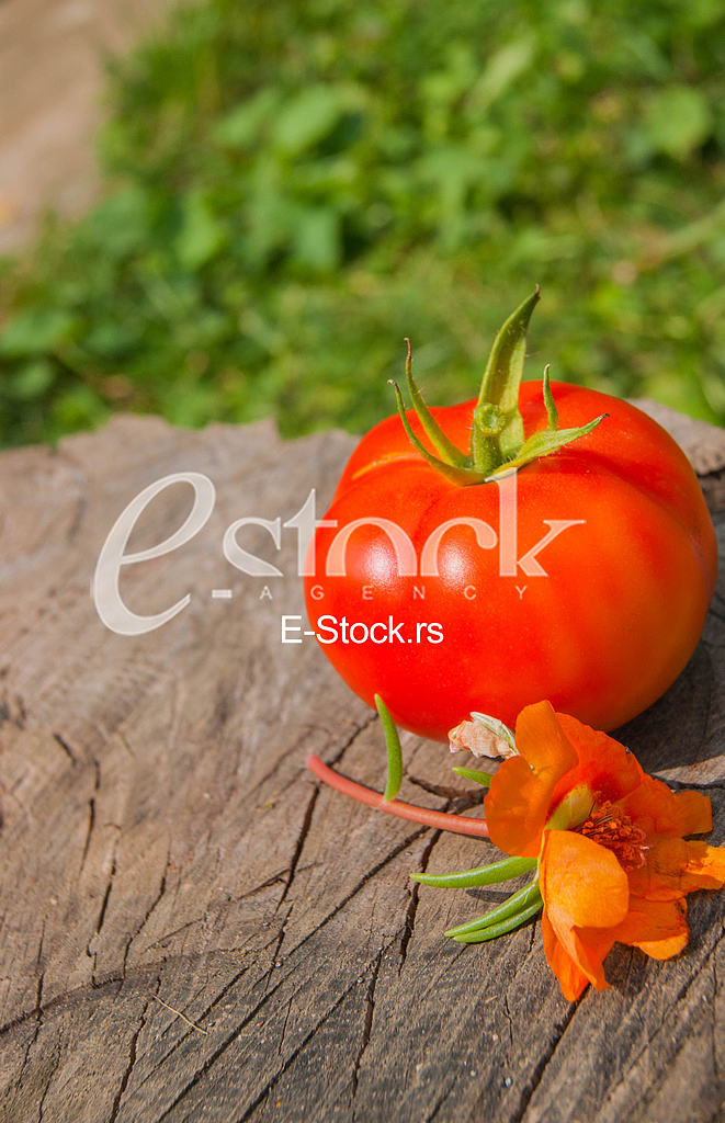 - Description: Fresh organic Tomato with flower on the stump in the sunny day