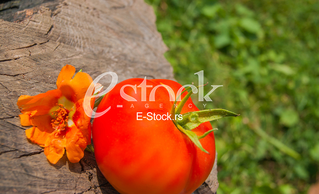 - Description: Fresh organic Tomato with flower on the stump in the sunny day