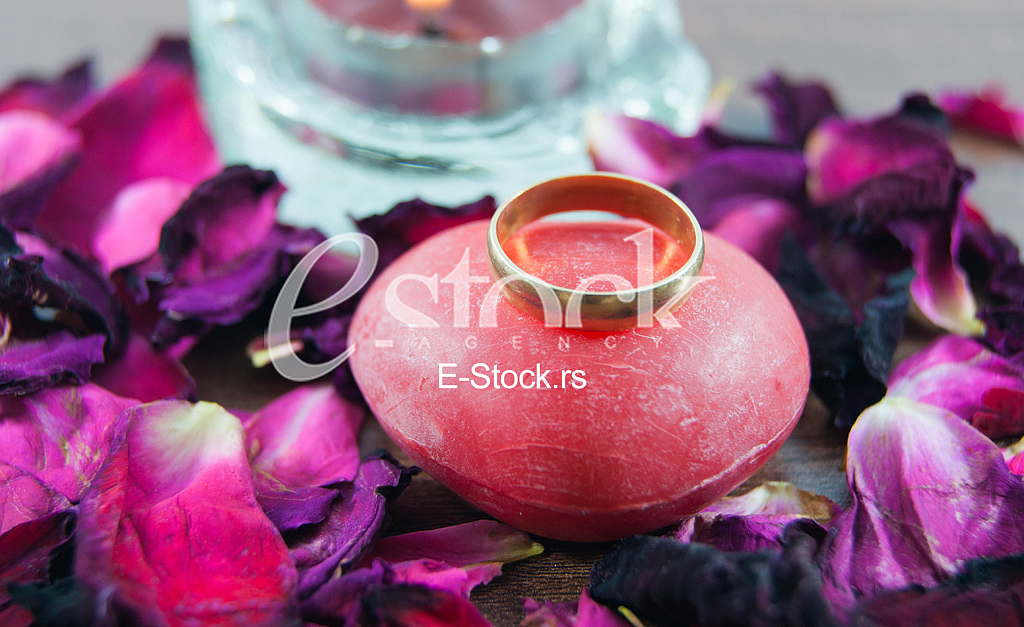 - Description: wedding gold ring on soap and petals of roses